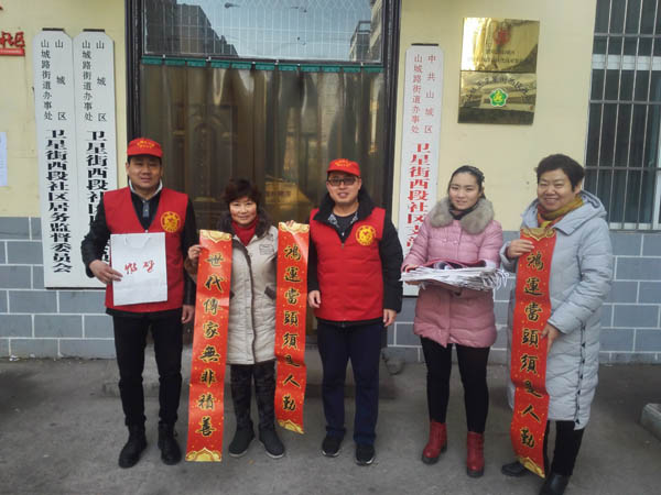 在山城区卫星街西段社区,我们的志愿者把崭新的春联带着我们的祝福送到居民手中,领到春联的居民笑逐颜开,在志愿者的询问下,居民都能说出社会主义核心价值观的部分内容,还有部分居民能够流利的说出社会主义核心价值观的全部内容。这也充分说明了我市文明创建工作开展的扎实有效,深入人心。