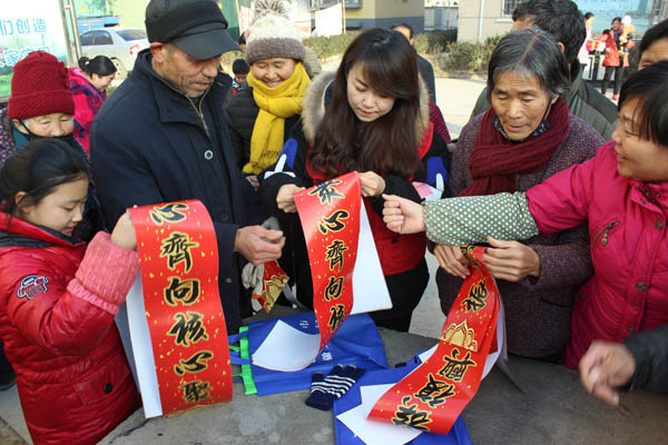 发春联的志愿者们被居民围得水泄不通,领取春联的人是络绎不绝。拿到春联后的居民脸上洋溢着幸福的笑容,活动现场温馨热烈。在这寒冷的冬季,虽然天空都是持续雾霾灰蒙蒙的,但是社区的居民们心里却是暖融融的,充满了阳光,深切感受到社会的温暖和关爱。