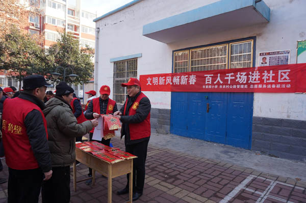 为进一步推进学校省级文明单位创建工作,培育和践行社会主义核心价值观,助力我市省级文明城市创建活动,增添节日喜庆气氛,1月12日上午九点,市第四小学十名党员志愿者到山城区宝马社区开展志愿服务送春联活动。