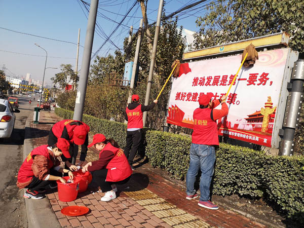 活动中,志愿者三两一组、分工明确,拿着水桶和抹布来到园区内,仔细的将宣传栏和公益广告牌上的灰尘擦洗干净,对于难以清理的污渍,志愿者们一点一点的用抹布和铲子慢慢清理,大家撸起袖子加油干,经过他们的努力,园区内的宣传栏和公益广告牌焕然一新,路过的居民纷纷为他们竖起大拇指。在整个志愿服务过程中,志愿者那鲜红的红马甲和小红帽成为了点亮文明城市风景中一道靓丽地风景线。