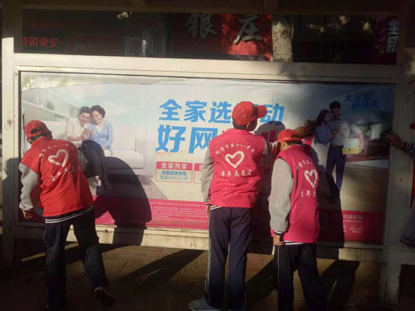 下午4:00,我校15名志愿者在学校门岗集合,带上清洁工具,走上人行道,擦拭道路旁公益广告牌,清理上面粘贴的小广告。大家干的热火朝天,身边不时传来路人的夸奖。