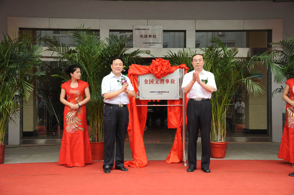 市委书记丁巍(右一),省检察院党组副书记、常务副检察长张国臣(左二)共同为市检察院“全国文明单位”揭牌。